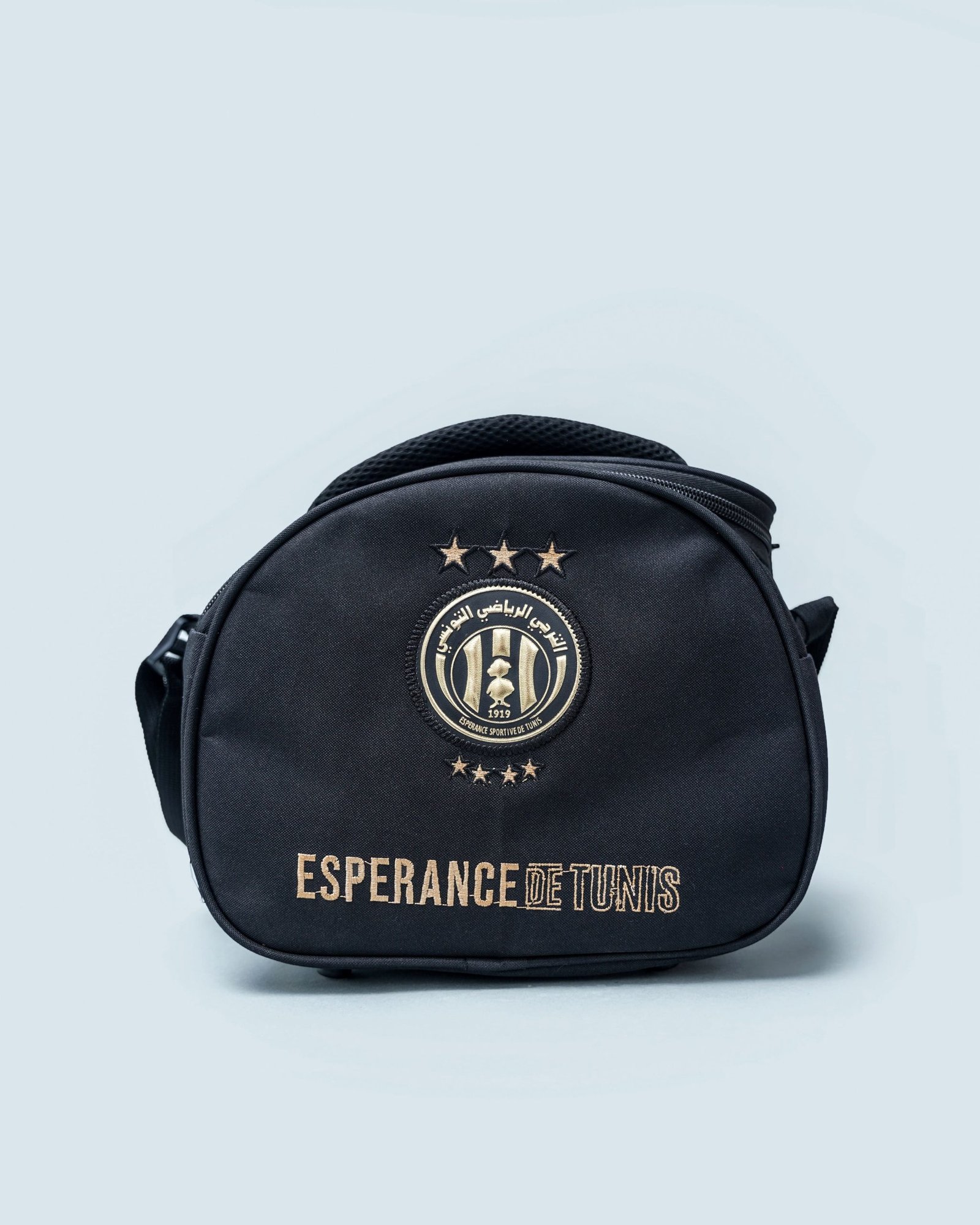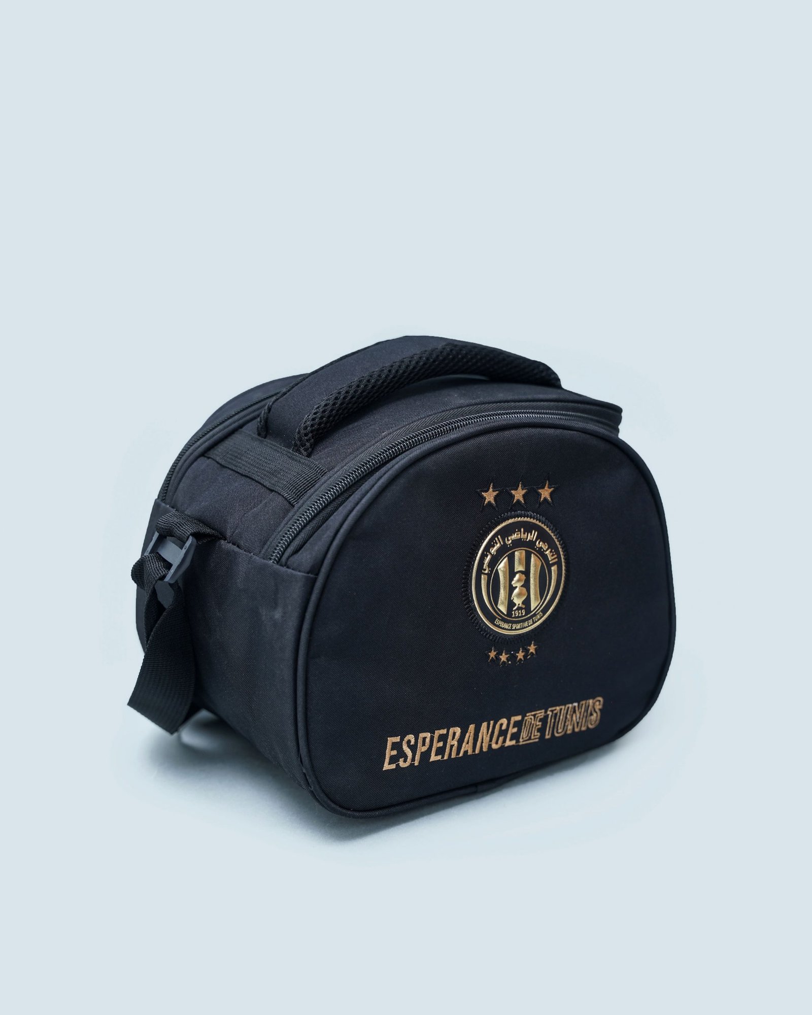 Disponible en bleu ou noir, ce panier séduit d’abord par sa forme arrondie et sa structure rigide, qui lui assurent une excellente tenue. Ensuite, l’avant du sac est marqué par un écusson brodé haut de gamme, accompagné des trois étoiles et de l’inscription « ESPERANCE DE TUNIS ». Ces éléments apportent une touche visuelle forte, sans tomber dans l’excès. En effet, le logo beige doré sur fond sombre crée un contraste chic et moderne, adapté à toutes les générations de supporters.