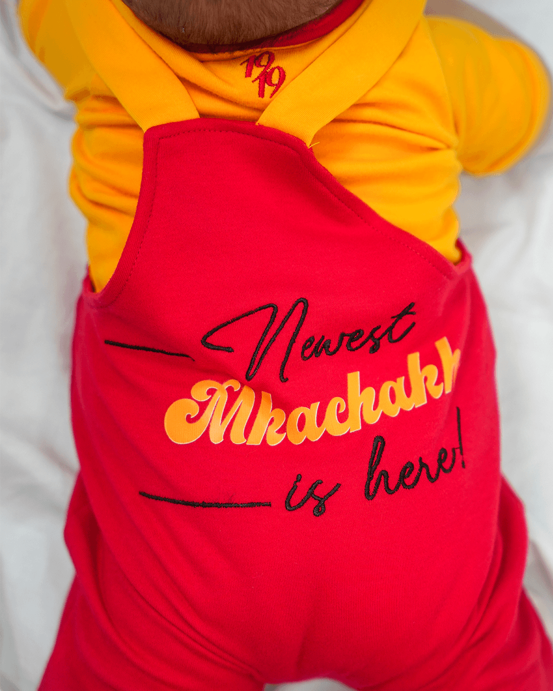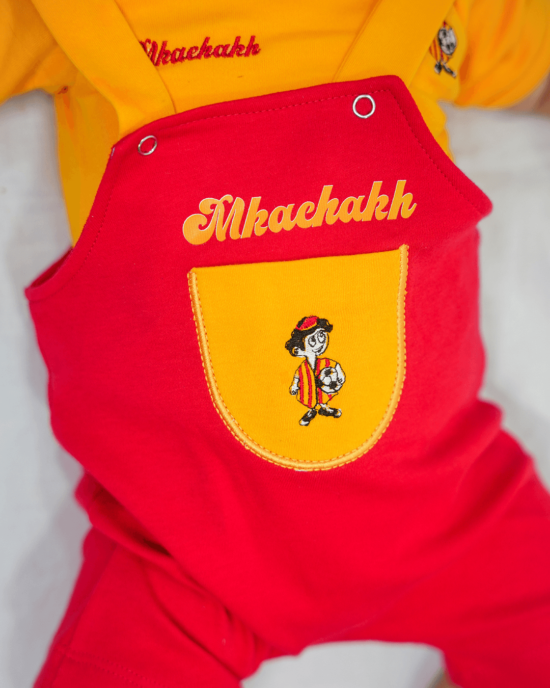 La pièce maîtresse de cet ensemble est la broderie « Mkachakh », clin d’œil affectueux à l’univers enfantin Taraji. La petite mascotte avec ballon, brodée sur la poche centrale, ajoute une touche ludique et joyeuse à la tenue. On retrouve également l’inscription « Mkachakh » brodée sur le haut du t-shirt et sur la salopette, pour une identité visuelle forte.
