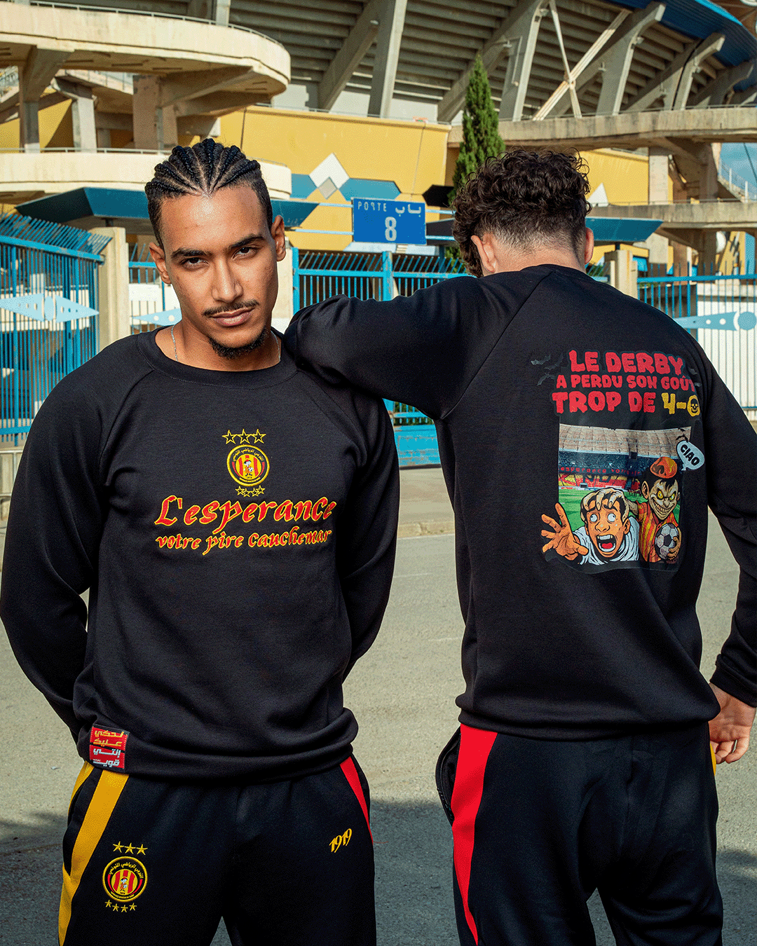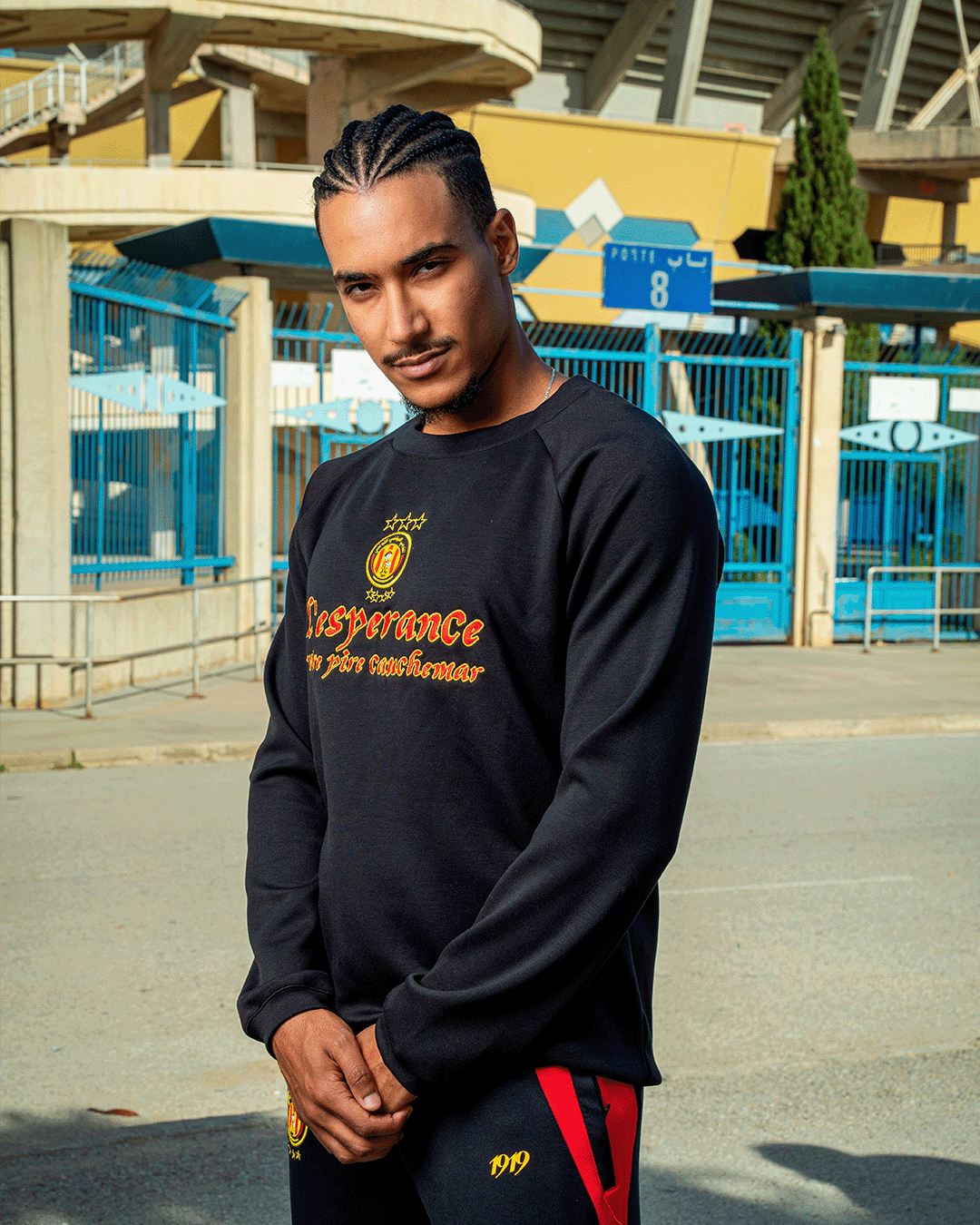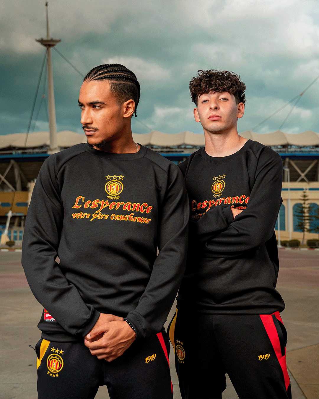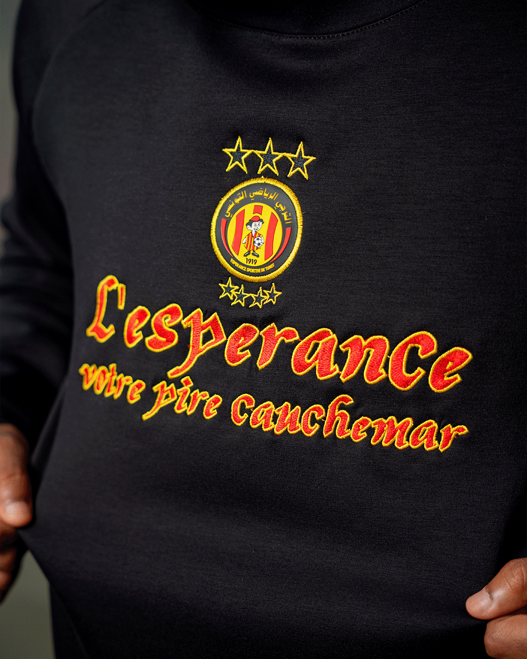 À l’avant, le sweat arbore fièrement le logo officiel de l’Espérance Sportive de Tunis en silicone gomme, accompagné de la signature rouge et jaune “L’Espérance, votre pire cauchemar”.